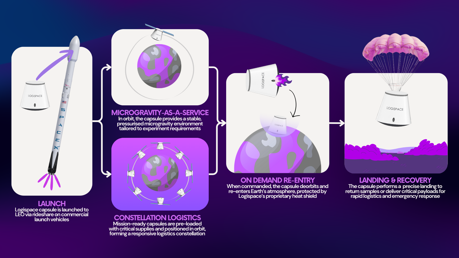 Rapid, on-demand delivery of payloads and samples from orbit to anywhere on Earth.